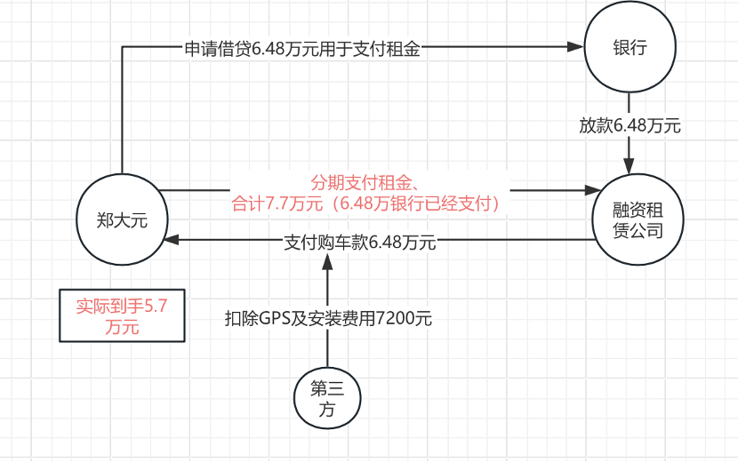 同一天,他还被引导与某银行签订了一份借款合同,申请了6.482万元的汽车金融贷款。该笔贷款在发放后,直接转给了融资租赁公司,用于支付购车款。