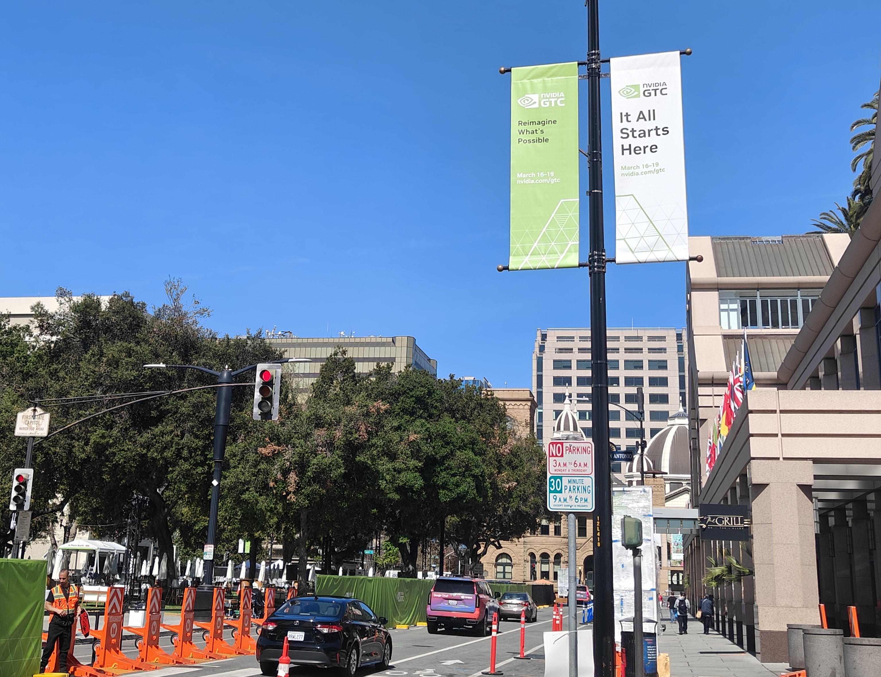 一些活动场地被围了起来,里面还在布置,附近一些小路暂时不能通行,工作人员在旁指引。包括SAP中心、圣何塞会展中心在内的活动举办场所所在的区域,随处可见路边GTC的标语“It All Starts Here”(一切从这里开始)。