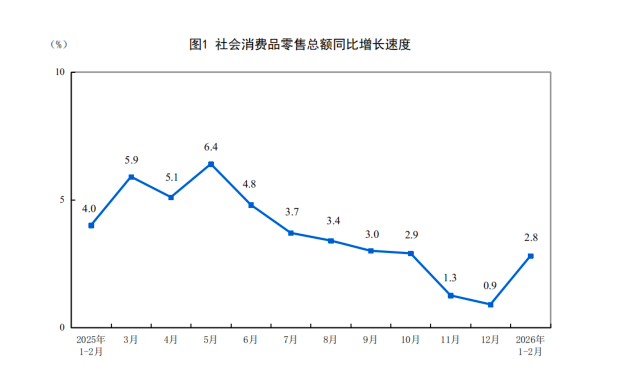 今年1-2月份,社会消费品零售总额86079亿元,同比增长2.8%,比上年12月份加快1.9个百分点。服务零售额同比增长5.6%,比上年全年加快0.1个百分点。