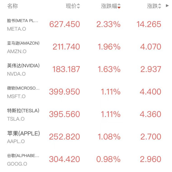 此外,亚马逊涨1.96%,微软涨1.11%,苹果涨1.08%,谷歌涨0.98%。