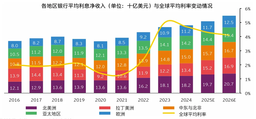 得益于接近10%的贷款增速及资产结构的持续优化,2025年全球银行业利息净收入增长超5%,预计2026年增速将突破7%。