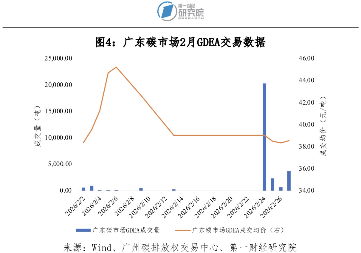 2月广东碳市场碳排放配额(GDEA)成交量29789吨,成交额116.32万元。期间,最高价48.88元/吨,最低价38.01元/吨,成交均价39.05元/吨。2月最后一个交易日收盘价38.56元/吨,较1月最后一个交易日收盘价39.11元/吨下跌1.41%。截至2026年2月28日,自开市以来GDEA累计成交量2.33亿吨,累计成交额67.86亿元。