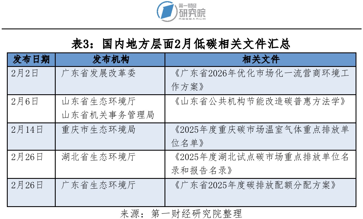 广东支持碳期货相关研究:2月2日,广东省发展改革委印发《广东省2026年优化市场化一流营商环境工作方案》,提出推动碳排放权交易市场建设,支持广州期货交易所推进碳排放权期货市场建设,适时研究推出碳排放权相关的期货品种。