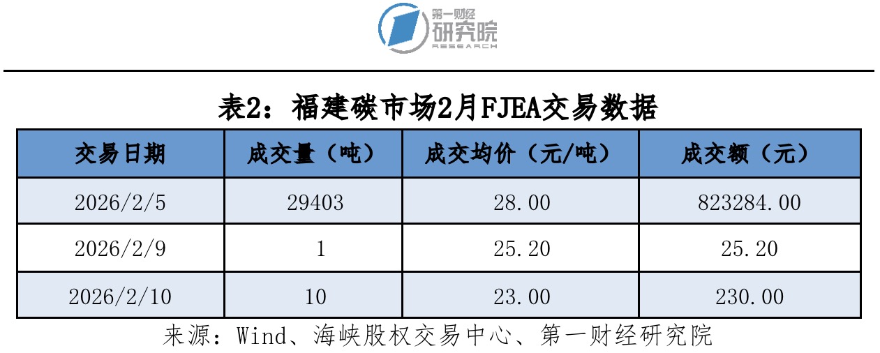2月福建碳市场碳排放配额(FJEA)成交量29414吨,成交额82.35万元。2月最后一个交易日收盘价23.00元/吨,较1月最后一个交易日收盘价28.00元/吨下跌17.86%。
