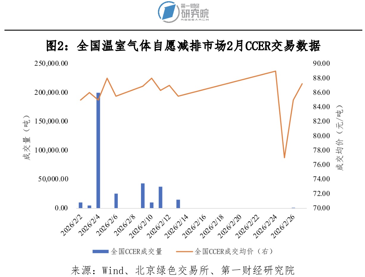 2月国家核证自愿减排量(CCER)总成交量34.72万吨,总成交额2969.93万元,成交均价85.53元/吨。2月最后一个交易日成交均价87.22元/吨,较1月最后一个交易日成交均价84.00元/吨上涨3.83%。截至2026年2月28日,自开市以来CCER累计成交量1062.38万吨,累计成交额7.59亿元。