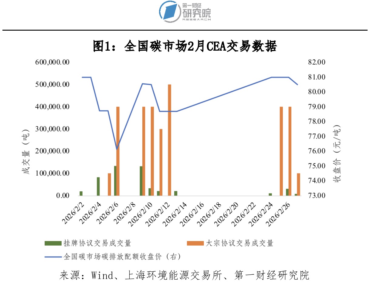 2月,全国碳排放权交易市场(CEA)成交量和成交额均大幅下降,环比降幅分别约为68%和66%。月初碳价维持在80元/吨上下震荡,虽在2月6日小幅下探至低点76.14元/吨,但9日即回升至80.56元/吨,月末最终以80.50元/吨收盘。受春节长假影响,2月全国碳市场交易活跃度显著下降,加之处于履约期后的交易淡季,市场流动性明显降温。
