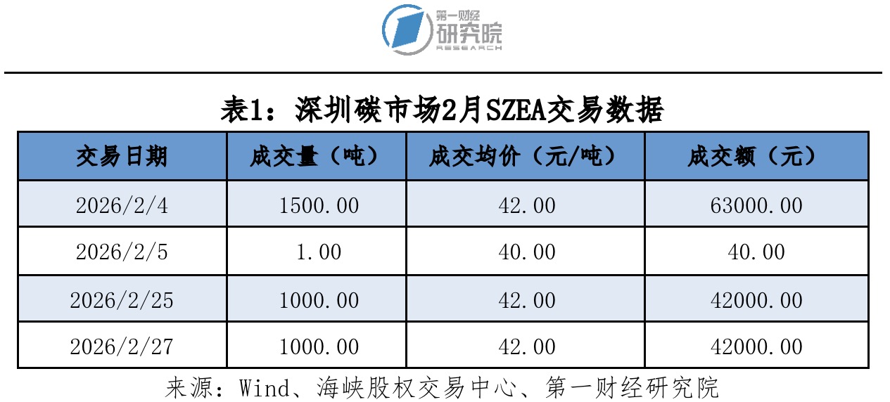 2月深圳碳市场碳排放配额(SZEA)交易成交量3501吨,成交额14.70万元,最高价42.00元/吨,最低价40.00元/吨,成交均价42.00元/吨。2月最后一个交易日收盘价42.00元/吨,较1月最后一个交易日收盘价39.90元/吨上涨5.26%。截至2026年2月28日,自开市以来SZEA累计成交量8001.39万吨,累计成交额21.80亿元。