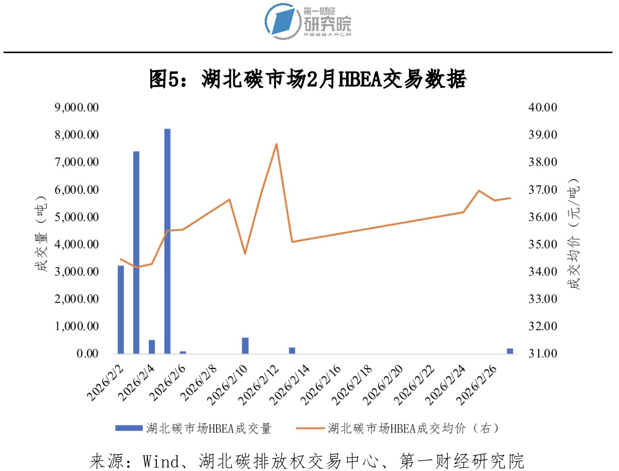2月湖北碳市场碳排放配额(HBEA)交易成交量20589吨,成交额71.69万元。期间,最高价38.68元/吨,最低价33.00元/吨,成交均价34.82元/吨。2月最后一个交易日收盘价36.70元/吨,较1月最后一个交易日收盘价35.07元/吨上涨4.65%。截至2026年2月28日,自开市以来HBEA(不包括逆回购和还碳)累计成交量4.24亿吨,累计成交额105.26亿元。
