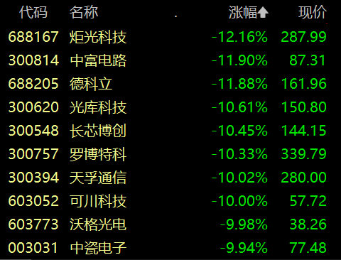 CPO板块调整,炬光科技跌超12%,德科立、中富电路跌超11%。