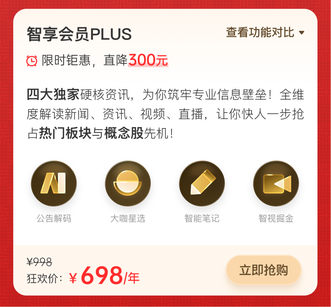 活动规则:2026年3月18日- 4月20日,限时1个月专属福利,智享会员Plus年单直降300元/年,性价比直接拉满!还有4款定制狂欢套餐同步解锁,低至16元 /天就能拿下专业投研利器,从新手入门到专业操盘,全阶段投资需求一站式配齐!