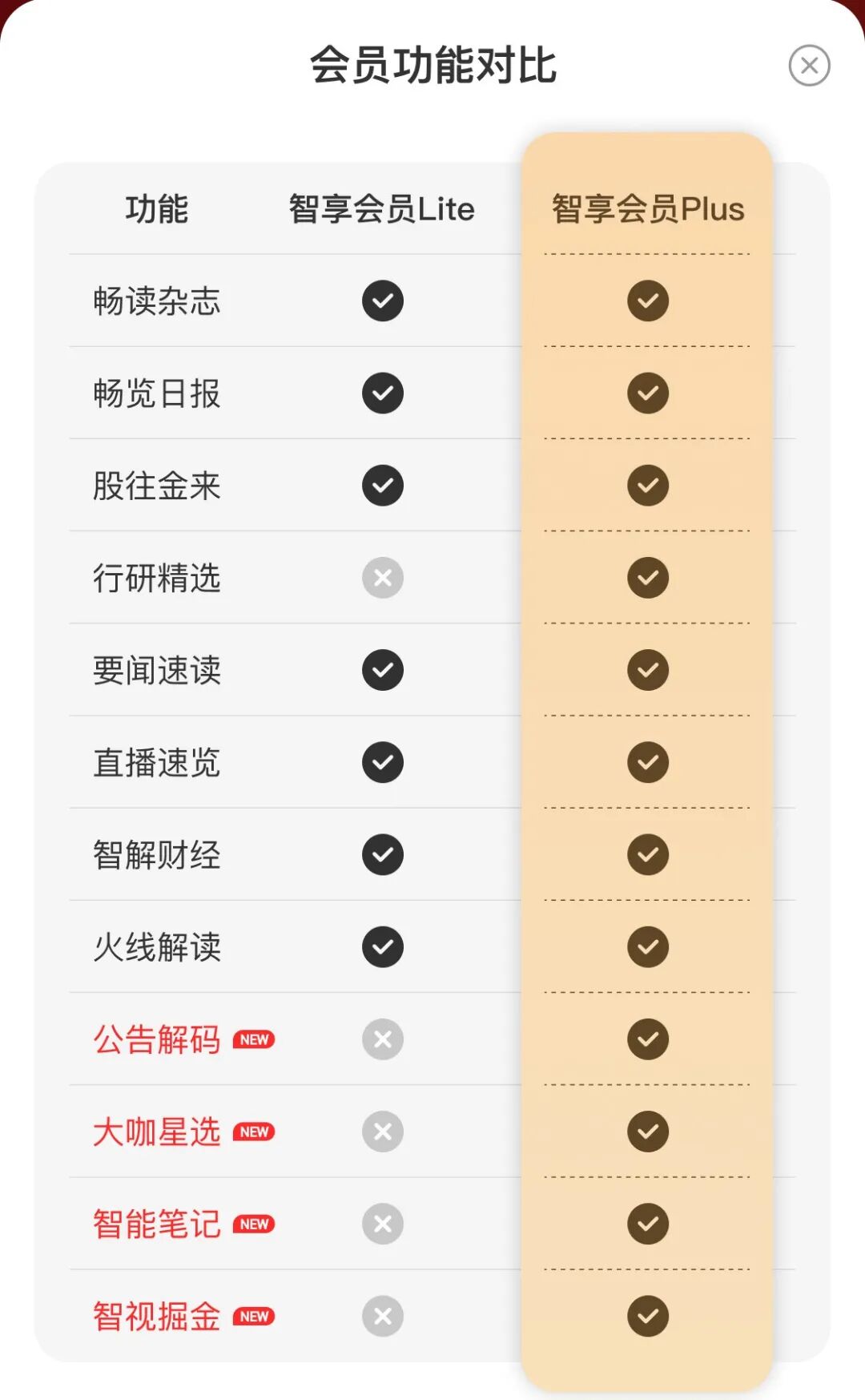 会员功能对比