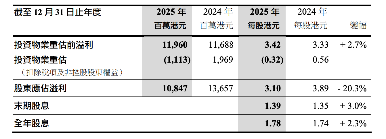 3月19日,长实集团发布2025年财报显示,报告期内实现收入579.35亿港元,按年增长27.25%;投资物业重估前溢利为119.6亿港元,每股溢利3.42港元,同比上年增长2.7%。计入投资物业重估带来的影响后,长实在2025年的股东应占溢利为108.47亿港元,每股溢利为3.1港元,较上年度减少20.3%。