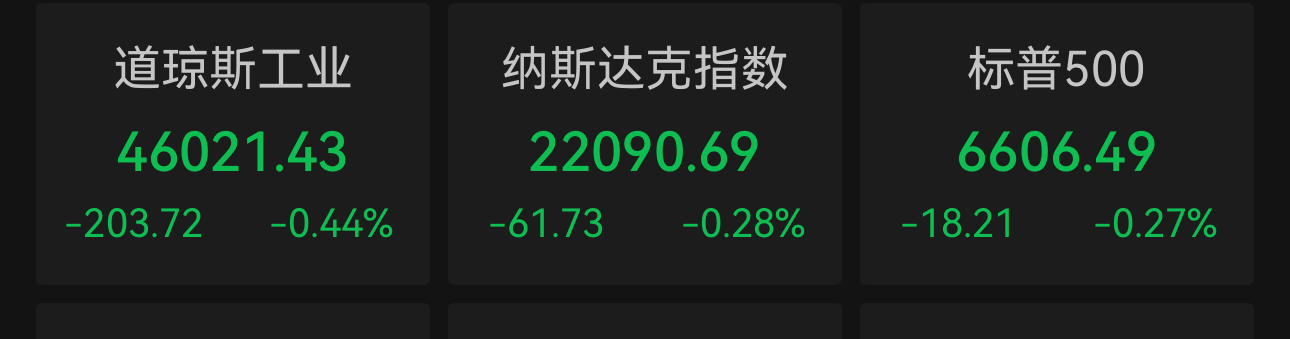截至收盘,道琼斯工业平均指数比前一交易日下跌203.72点,收于46021.43点,跌幅为0.44%;标普500指数下跌18.21点,收于6606.49点,跌幅为0.27%;纳斯达克综合指数下跌61.73点,收于22090.69点,跌幅为0.28%。至此,三大股指均跌破200日移动均线,显示中期趋势出现转弱信号。标普500指数年内累计跌幅约3.5%,处于近四个月低位。市场此前依赖的“降息交易”逐步松动,风险偏好明显回落。