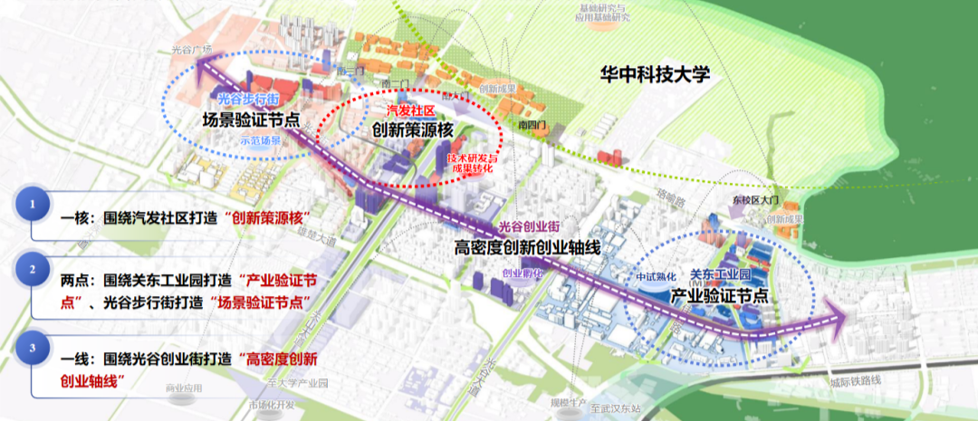 中指研究院(华中)市场研究中心主任李国政对第一财经记者表示,根据规划,关东科技园将与光谷创业街、光谷步行街形成连片更新,通过改善周边环境、完善生活配套、打通地理阻隔,实现“园区、校区、社区、街区”无界融合,让产业空间同时成为城市的“公共客厅”,“下楼喝茶聊天,上楼创新创业”,形成“上下楼”变“上下游”等创业创新生态圈,促进更多的“化学反应”,实现高质量的产城融合发展。