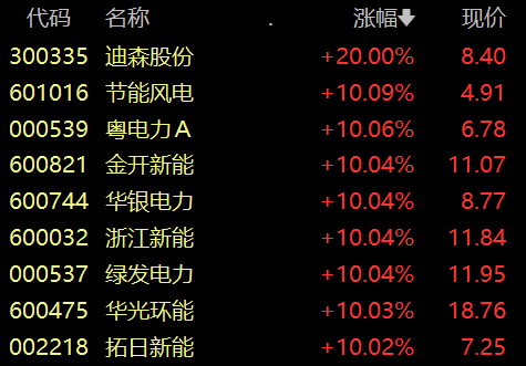 具体来看,电力板块掀涨停潮,迪森股份、节能风电、金开新能、华银电力等多股涨停。