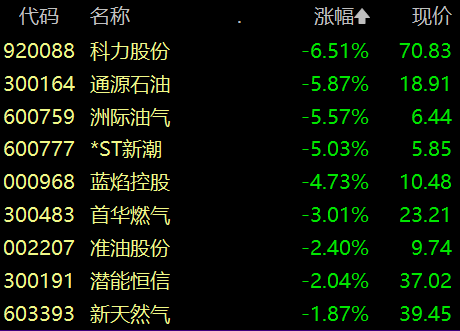 油气板块调整,科力股份跌超6%,通源石油、洲际油气跌超5%。