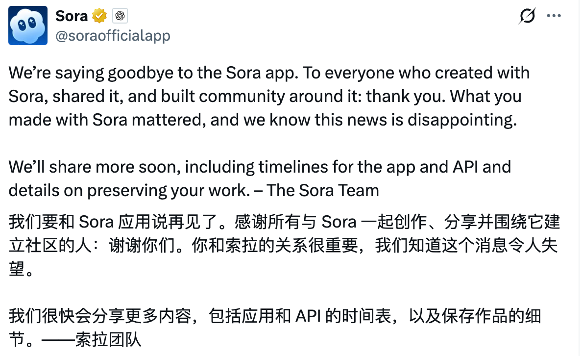 北京时间3月25日,Sora在社交平台发文称:“我们即将停用Sora应用。向每一位曾用Sora 进行创作、分享,并围绕它建立社区的朋友表示:由衷感谢你们。我们也深知这个消息令人失望。我们将尽快公布更多信息,包括应用与API 的下线时间安排,以及如何保留大家作品的详细方案。”而OpenAI CEO 山姆·奥尔特曼还在忙着宣传新模型、强调模型性能,尝试稳固外界对OpenAI的信任。