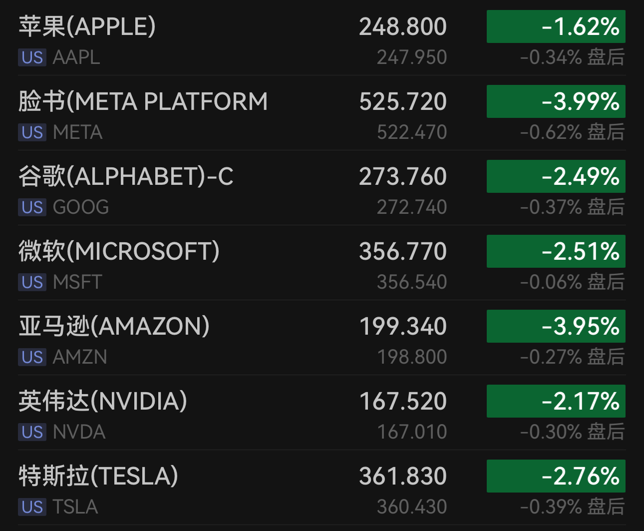 大型科技股普遍走弱。英伟达下跌2.17%,特斯拉下跌2.76%,Meta跌3.99%,微软跌2.51%,苹果跌1.62%,亚马逊跌3.95%,谷歌A类股跌2.34%,谷歌C类股跌2.49%,博通跌2.82%,超威半导体跌0.87%。