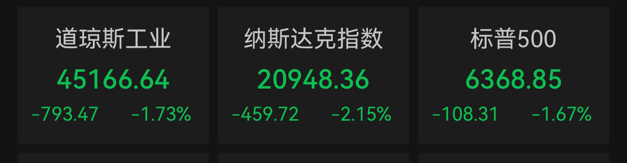 截至收盘,道琼斯工业平均指数下跌793.47点,收于45166.64点,跌幅1.73%;标普500指数下跌108.31点,收于6368.85点,跌幅1.67%;纳斯达克综合指数下跌459.72点,收于20948.36点,跌幅2.15%。三大股指均连续第五周下跌,标普500指数创近四年来最长周线连跌纪录。
