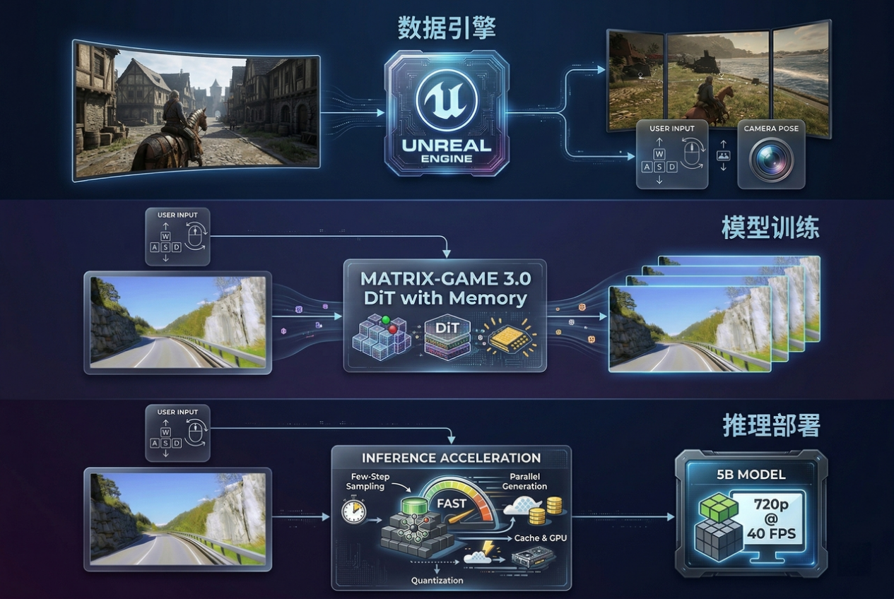 整体来看,Matrix-Game 3.0 的核心在于:通过“数据—模型—推理”的协同优化,首次将开源世界模型推向了带有记忆能力的长时序一致性 + 高质量 + 实时交互的统一框架。