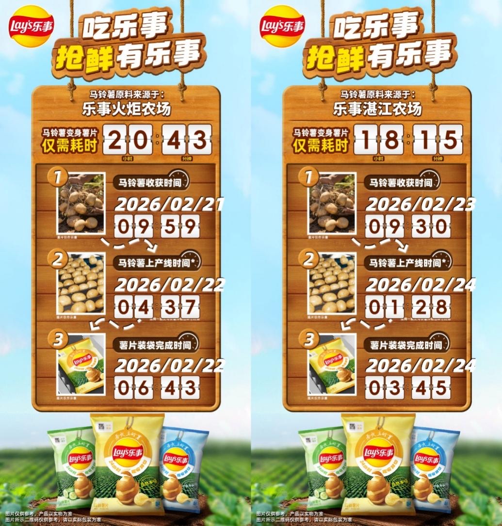 为了兑现这份新鲜承诺,乐事确立了“24小时现收鲜切”的标准:马铃薯从田间采收到完成装袋的全过程被严格控制在24小时内,锁住春收土豆的自然薯香。值得一提的是,这份“看不见”的速度还有“看得见”的验证——乐事在包装上特别植入溯源二维码。消费者扫码即可查阅从田间采收、产线加工到成品装袋的关键链路。生产流程的透明化与可视化,为乐事的品质承诺提供了坚实的底气。