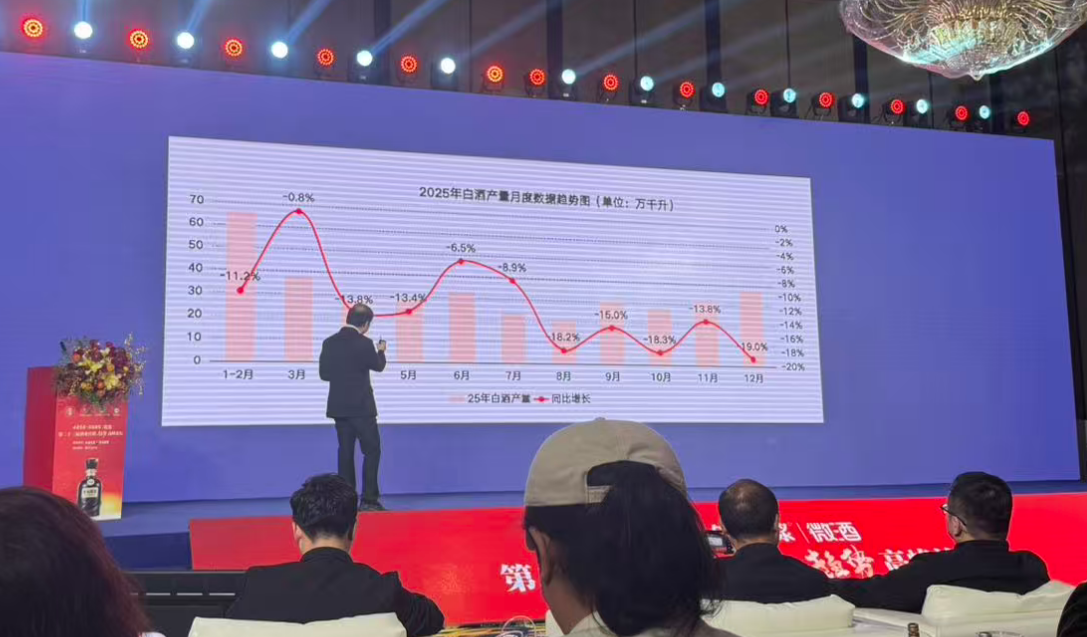 国家统计局数据显示,2025年国内规模以上白酒生产企业生产的白酒(折65度,商品量)产量累计354.9万千升,同比下降12%,特别是从2025年8月开始,连续5个月出现双位数下滑。据知情人士透露,这一数据实际为白酒的产销量,其下滑也直接反映市场的变化。