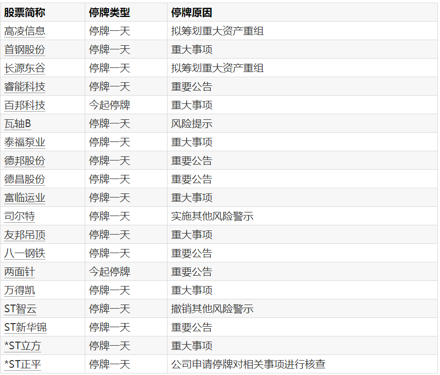 A股停牌提示:19股今日停牌