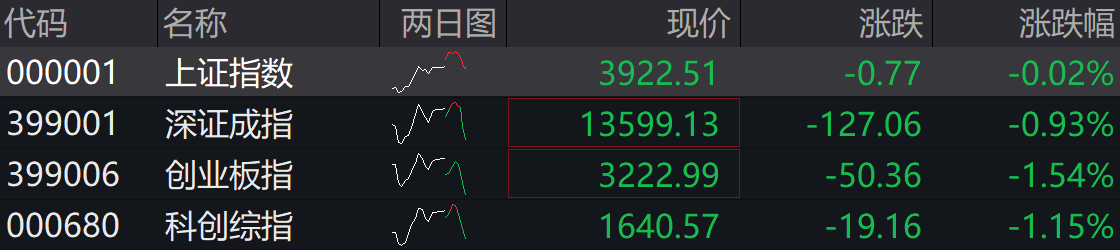 11:00 A股四大指数集体下挫翻绿,创业板跌超1%,全市场超3000家个股下跌,煤炭、油气板块跌幅居前。