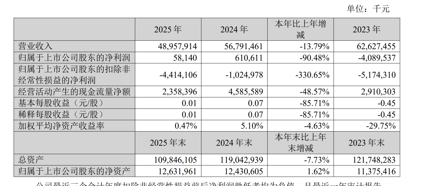 3月31日晚,苏宁易购(ST易购;002024)发布2025年度财报,财报显示,报告期内,苏宁实现营业收入489.58亿元,同比下滑13.79%;归母净利润5814.00万元,同比下滑90.48%,归属于上市公司股东的扣除非经常性损益的净利润为-44.14亿元。