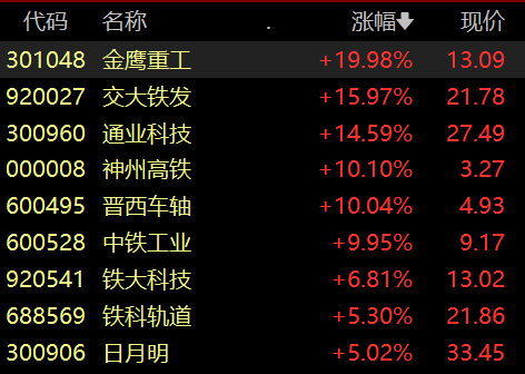 具体来看,轨交设备板块走高,金鹰重工、神州高铁、晋西车轴、中铁工业涨停。