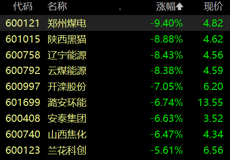 煤炭板块调整,郑州煤电跌超9%,陕西黑猫、云煤能源、辽宁能源跌超8%。