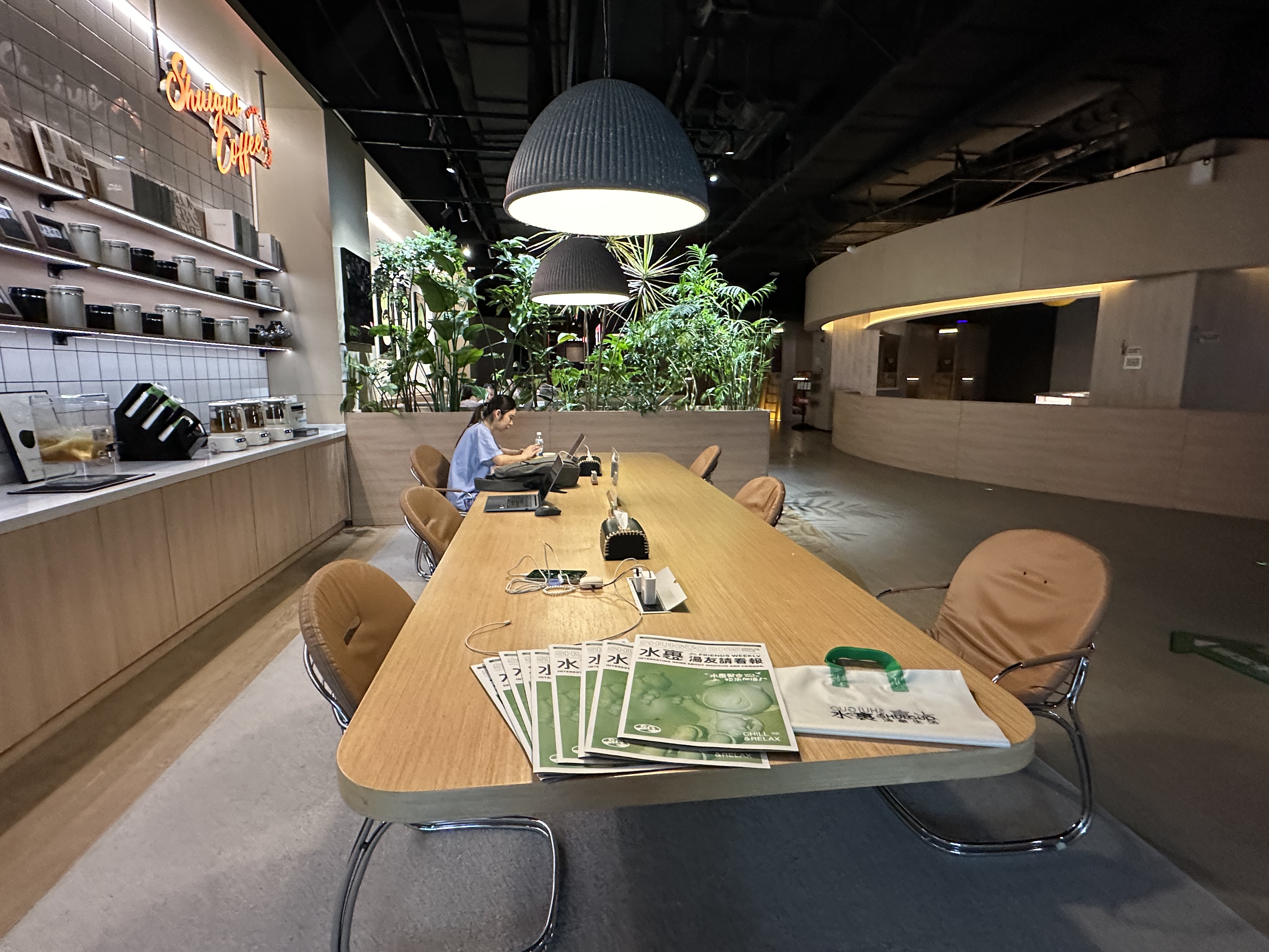 第一财经记者在水裹汤泉生活中心现场看到,洗浴中心还设置了专门的办公桌区域,配备了充电、茶水等,类似共享办公模式。