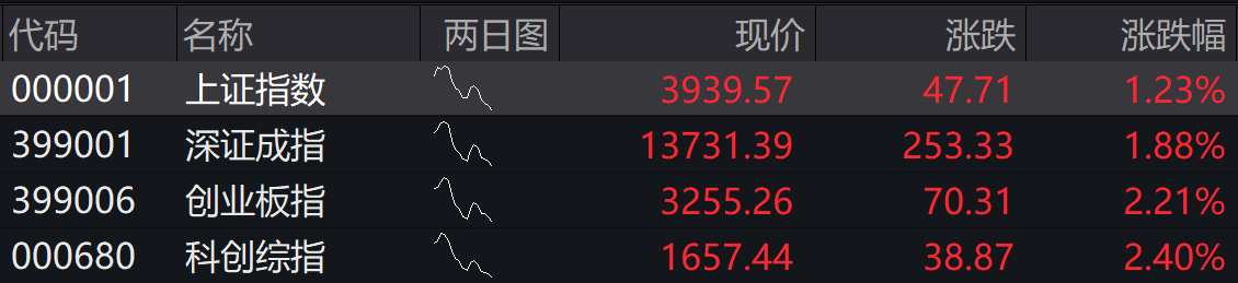 4月1日,A股四大指数全线高开,上证指数涨1.23%,深证成指涨1.88%,创业板指涨2.21%,科创综指涨2.40%。