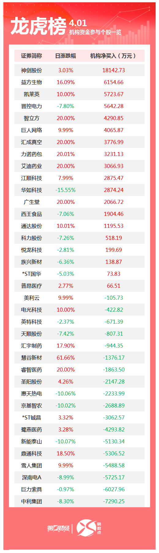 当天机构净买入前三的股票分别是神剑股份、益方生物、凯莱英,净买入金额分别是1.81亿元、6155万元、5724万元。