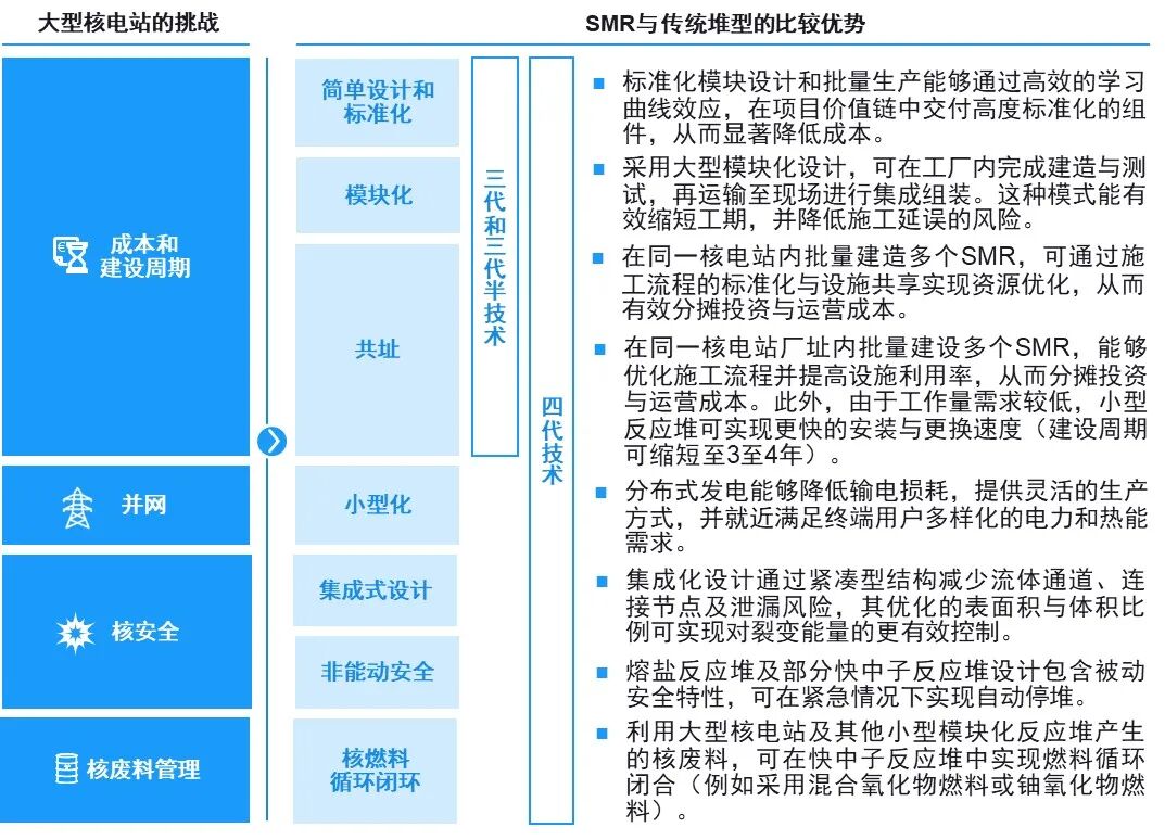 SMR是功率在200-300兆瓦之间的先进核反应堆,其发电能力约为传统大型核电站的三分之一。其核心特征体现在三个方面: