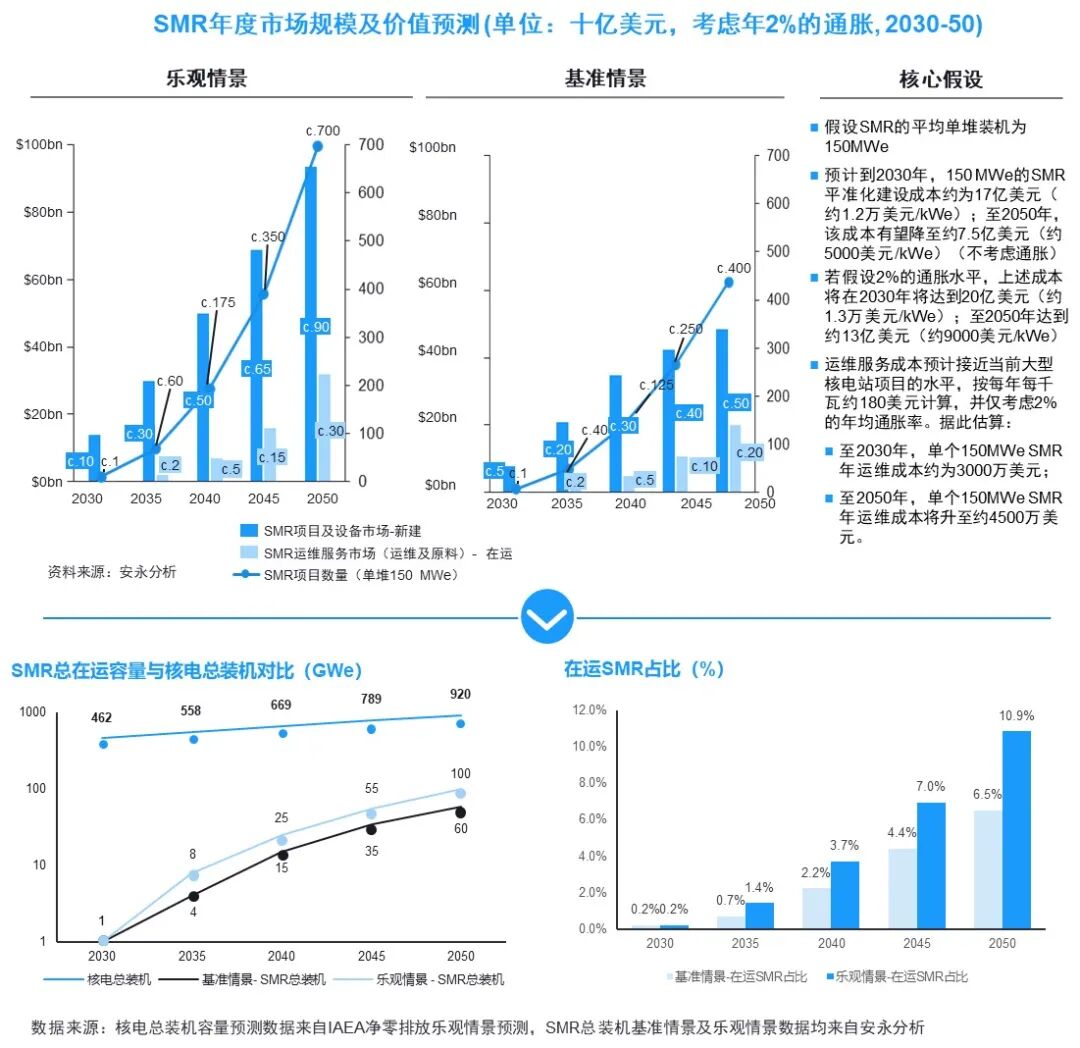 根据我们的模型预测,全球SMR项目数量在2050年将可能达到400-700个(150MWe),装机规模在60-100GWe之间,每年约500-900亿美元新建项目Capax和约200-300亿美元的核燃料以及Opex支出。