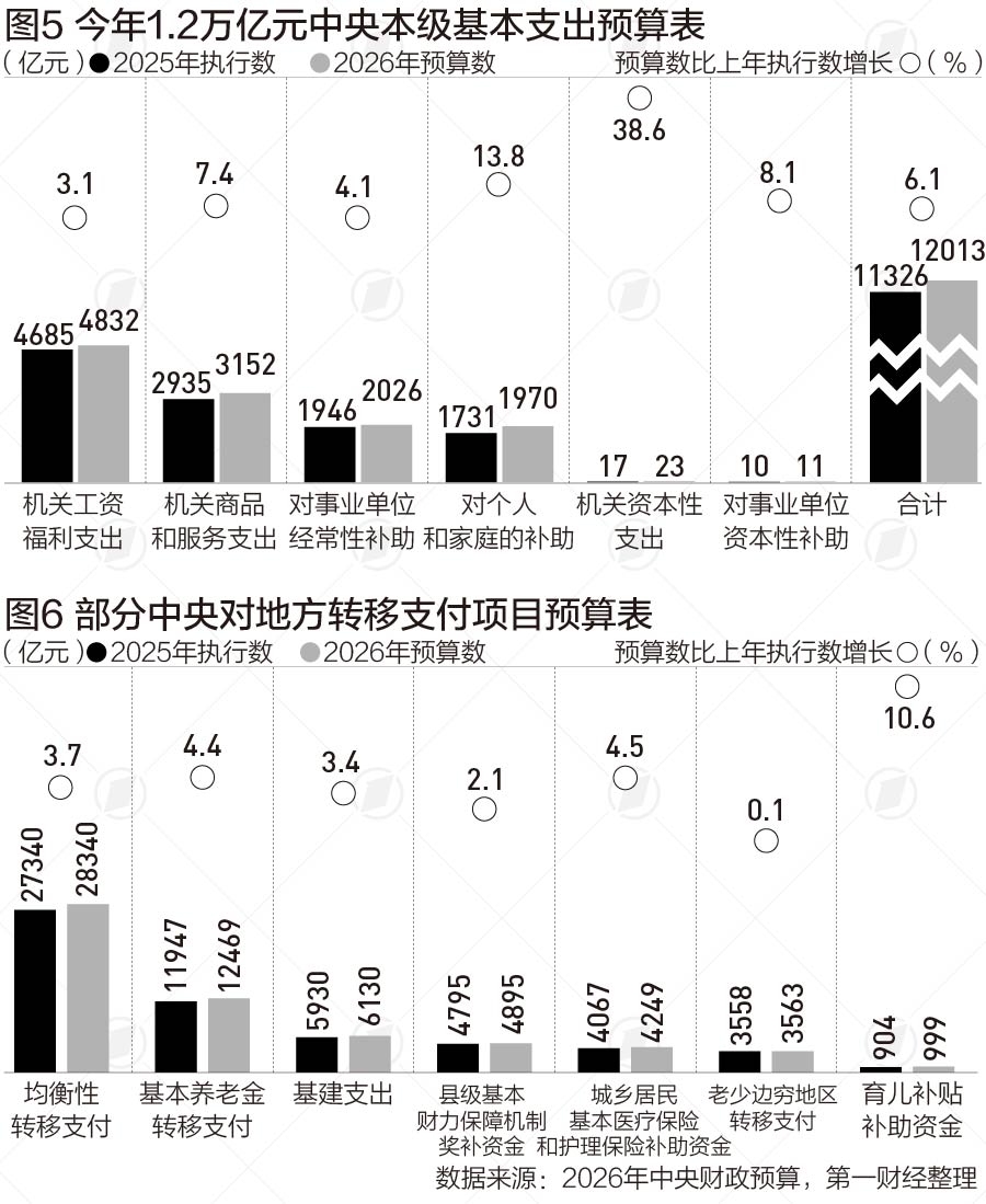 财政部披露的《2026年中央本级基本支出预算表》显示,今年约1.2万亿元按经济性质分类支出具体安排。其中,机关工资福利支出预算数约0.48万亿元,比2025年执行数增长3.1%;机关商品和服务支出预算数约0.32万亿元,增长7.4%。机关商品和服务支出中的“三公经费”、会议费、培训费等科目预算增幅较高。财政部解释称,这主要是压减项目支出后,确需安排的相关经费由基本支出统筹安排。