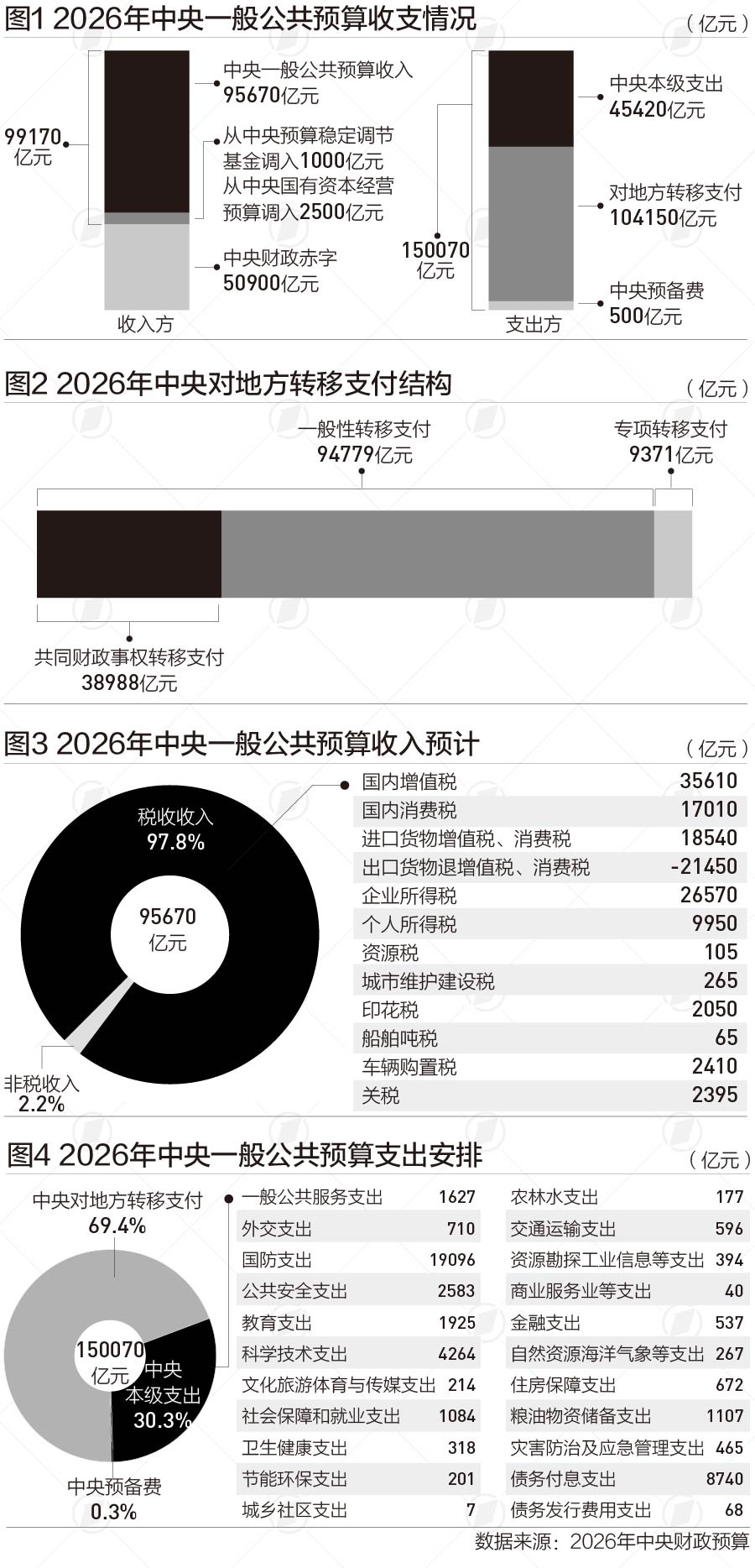 根据《收入预算表》,今年中央税收收入主要来自国内增值税、企业所得税、国内消费税和个人所得税四大税种,合计接近9万亿元,占中央税收总收入比重约95%。