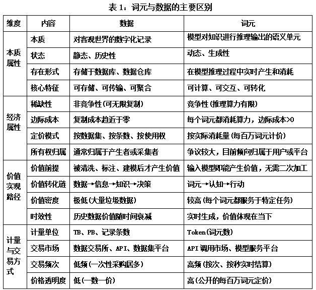 词元不同于数据,二者存在本质的区别(参见表1)。