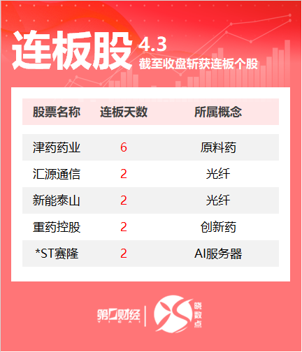 4月3日,Wind数据显示,A股市场共计39只个股涨停。其中光纤概念汇源通信、新能泰山收获2连板。一图速览今日连板股>>