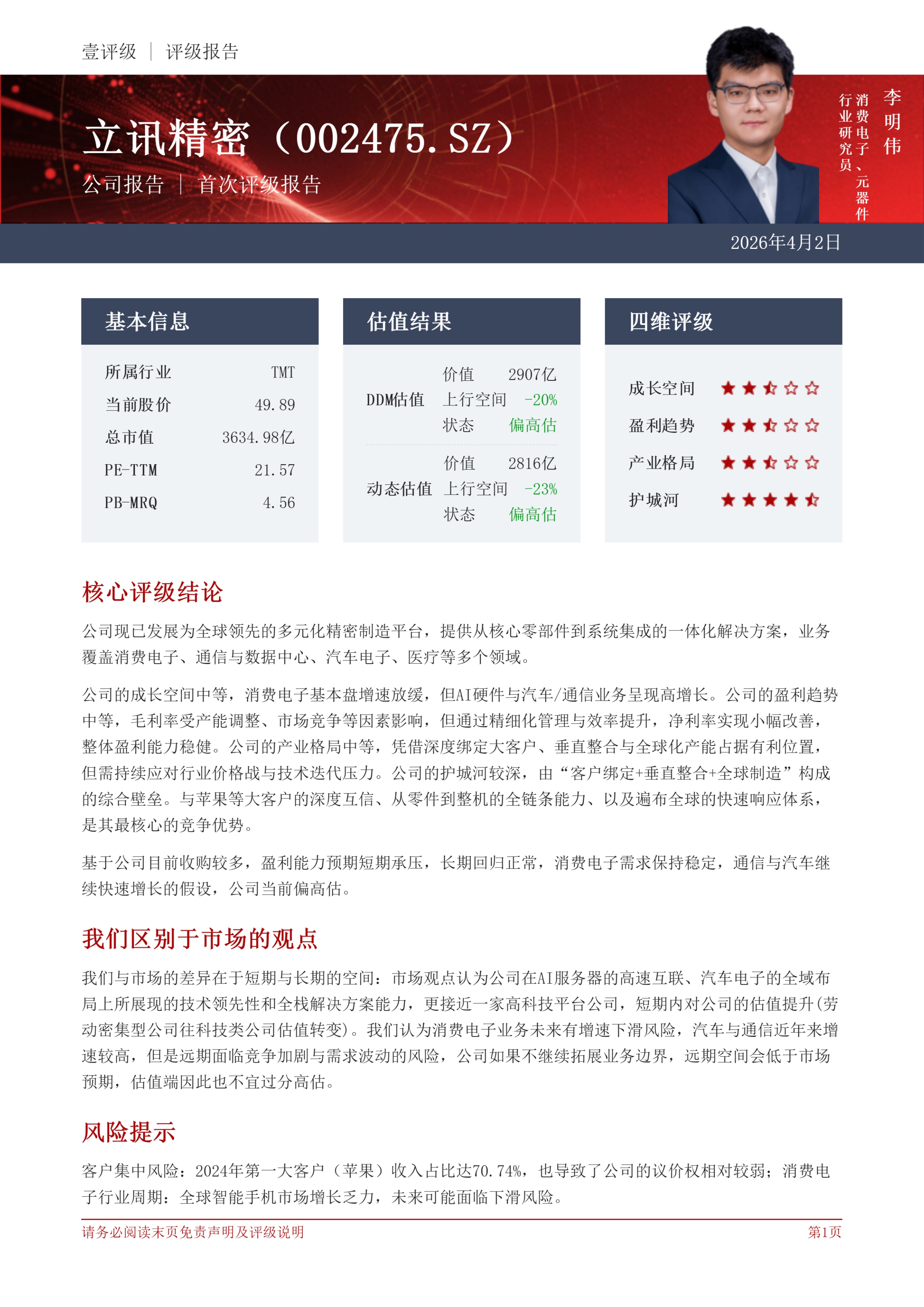 “壹评级”认为光威复材在成长空间、产业格局、护城河三个维度表现突出,因此分别给予4星、4星和4.5星评级。同时,“壹评级”动态估值模型和DDM估值模型显示光威复材当下市值基本合理。
