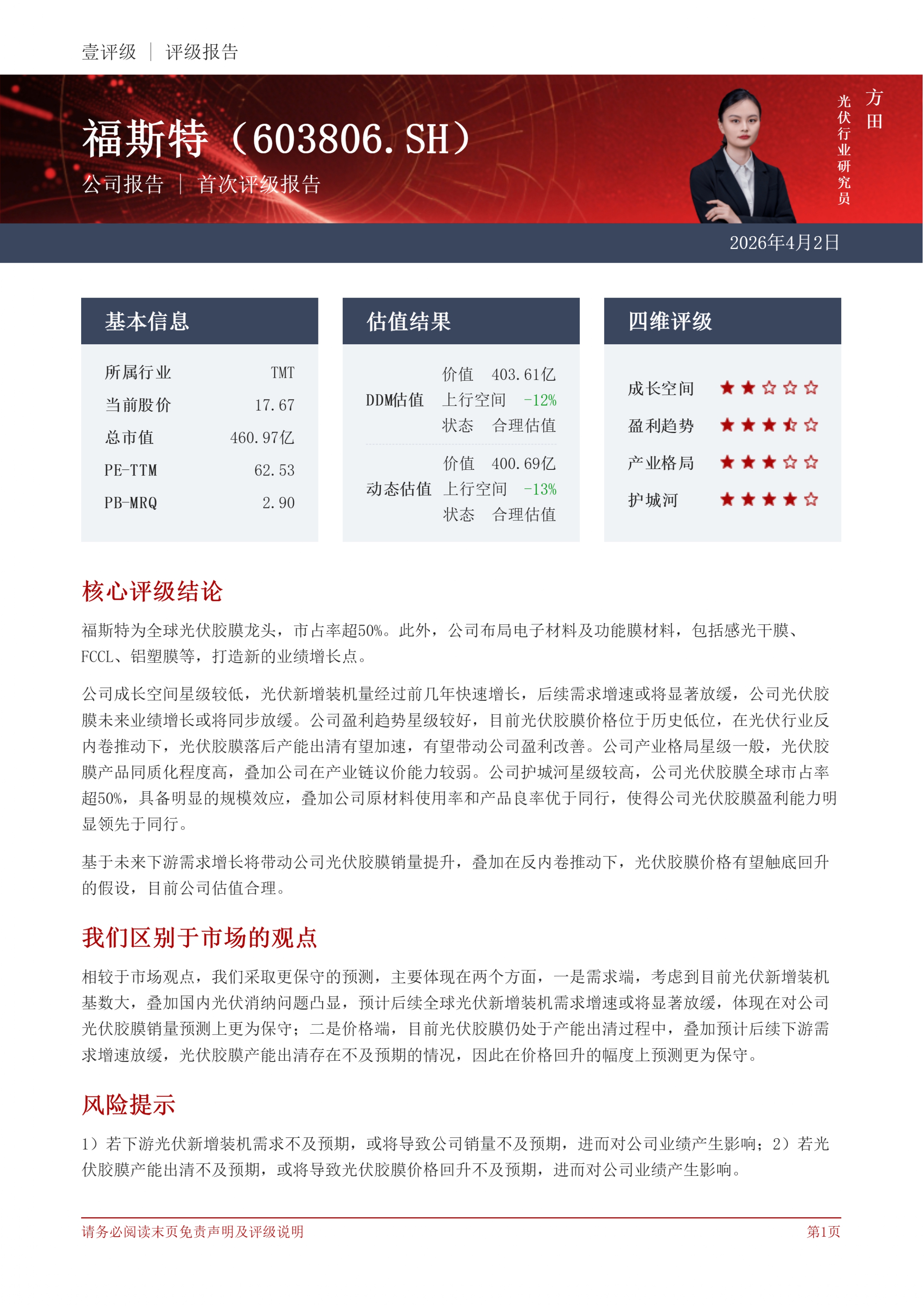 “壹评级”认为光威复材在成长空间、产业格局、护城河三个维度表现突出,因此分别给予4星、4星和4.5星评级。同时,“壹评级”动态估值模型和DDM估值模型显示光威复材当下市值基本合理。