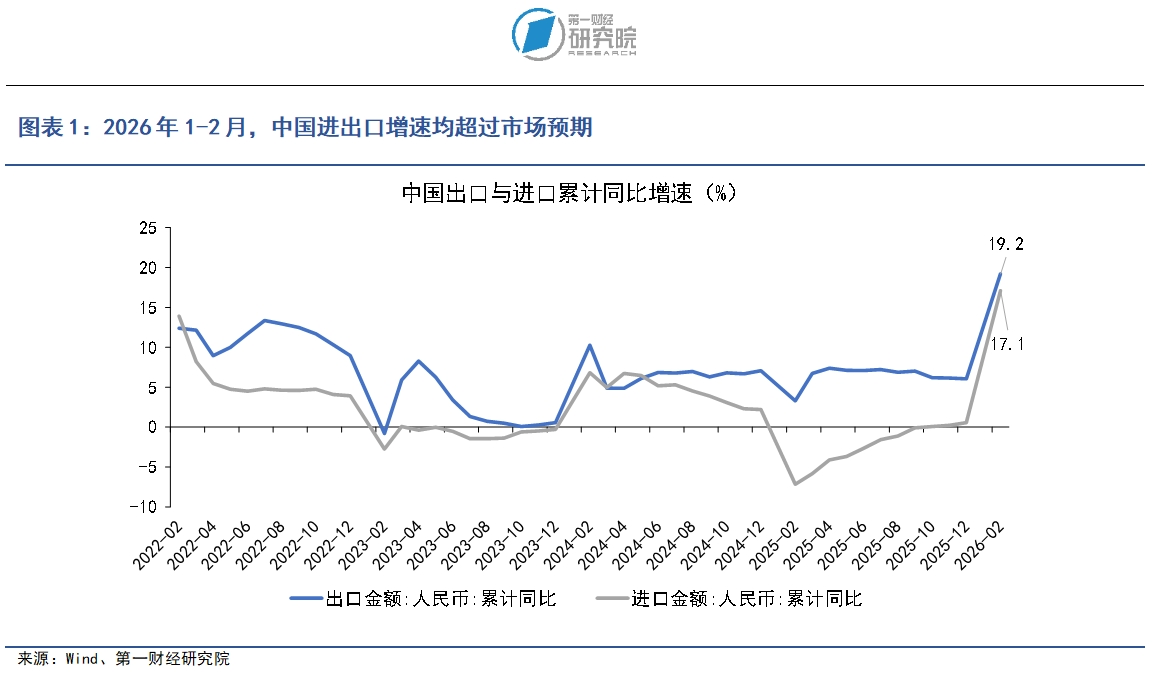 2026年1-2月,中国外贸强势开局。根据海关总署的数据,今年1-2月中国以人民币计价的进口累计同比增速为17.1%,出口累计同比增速为19.2%,均远超市场预期。