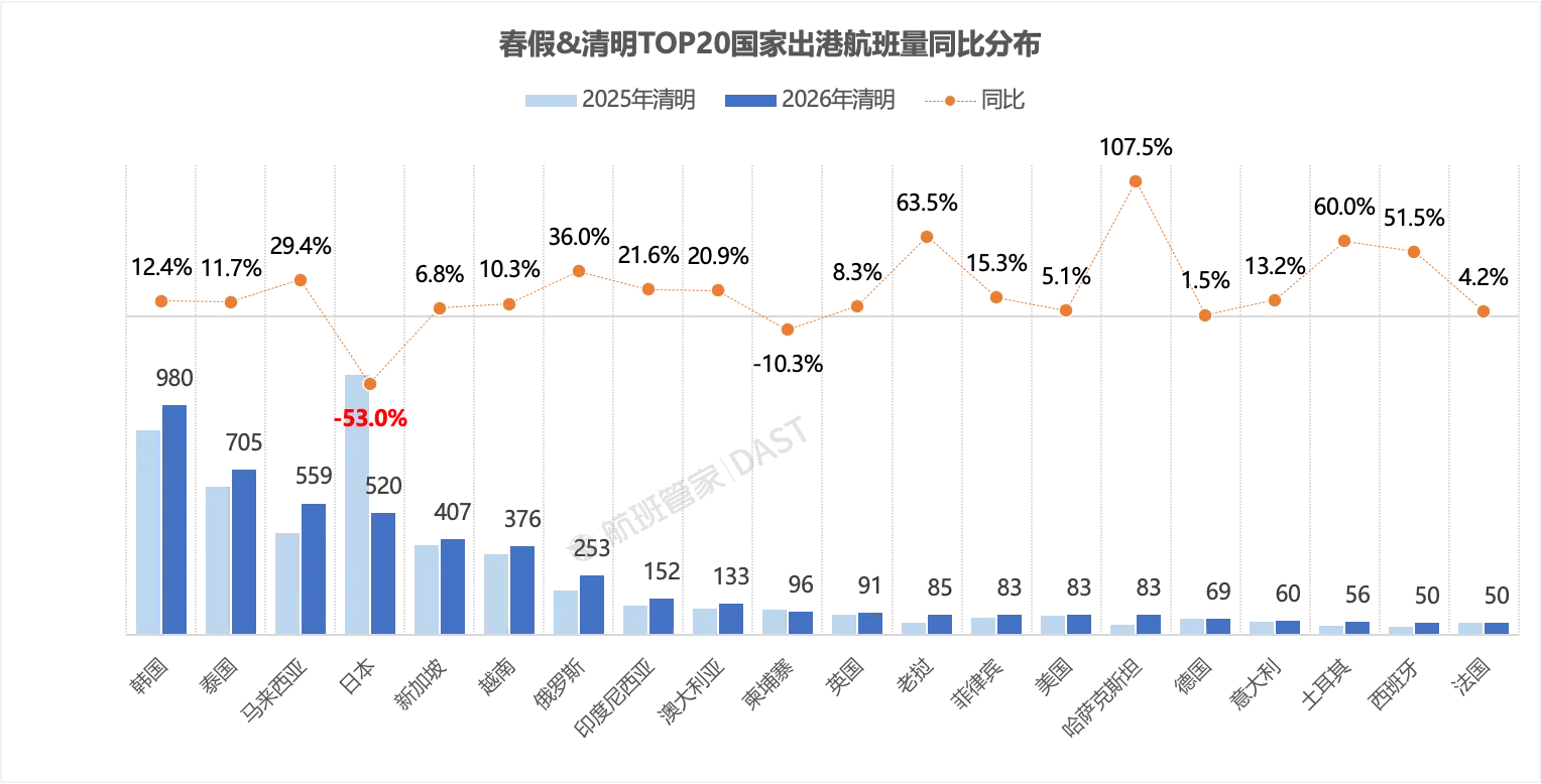 假期时间的拉长也催热了出境游,国际出港目的地东南亚地区航班占比最高。出港热门目的地国家中,韩国居第一,泰国、马来西亚、俄罗斯、哈萨克斯坦等国家航班增量靠前;日本航线大幅下降,同比下滑超5成,柬埔寨同比下降10.3%。
