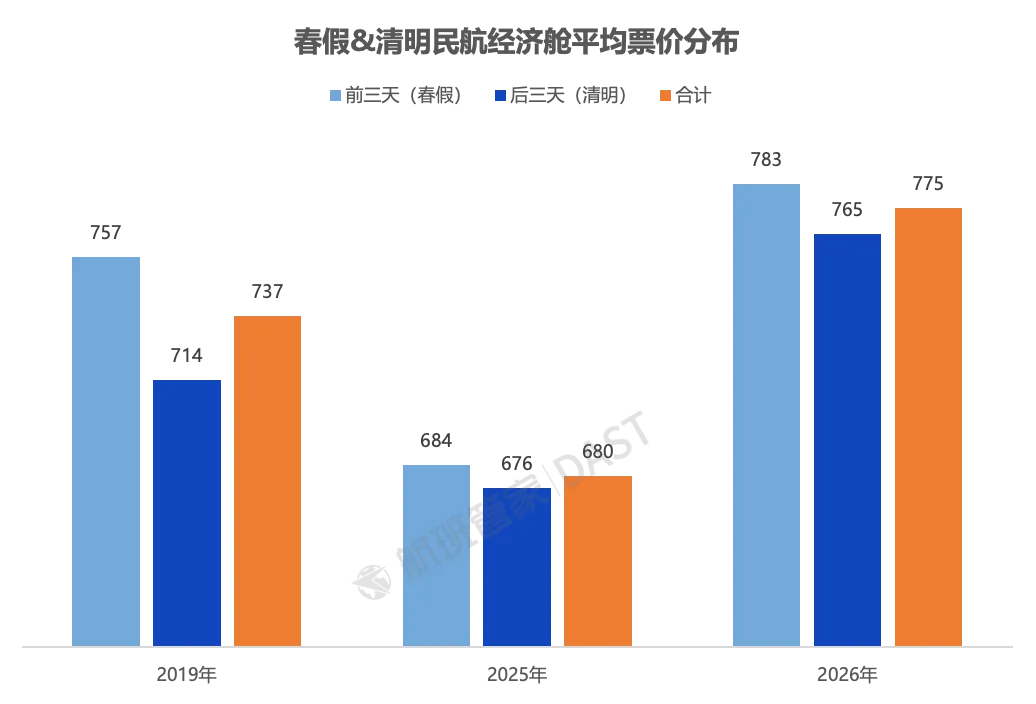 根据航班管家的监测,2026年春假&清明假期期间,民航国内经济舱平均票价达775元,同比2025年增长13.9%,同比疫情前的2019年也增长5.2%。