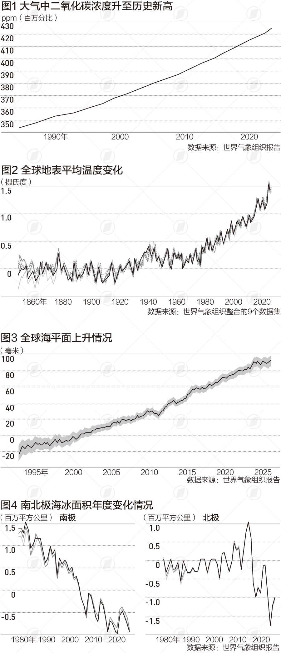 地球能量失衡的现状也直接印证了近年来人为温室气体排放造成的能量积累正在加速。报告显示,2024年大气中的二氧化碳浓度升至历史新高,为423.9ppm(ppm为百万分之一),较2023年增长3.5ppm,这是自1957年开始现代测量以来的最大增幅。同时,分列全球第二大和第三大温室气体的甲烷和氧化亚氮的浓度也均升至历史新高,2024年的全球年均浓度分别为1942ppb(ppb为十亿分之一)和338ppb。