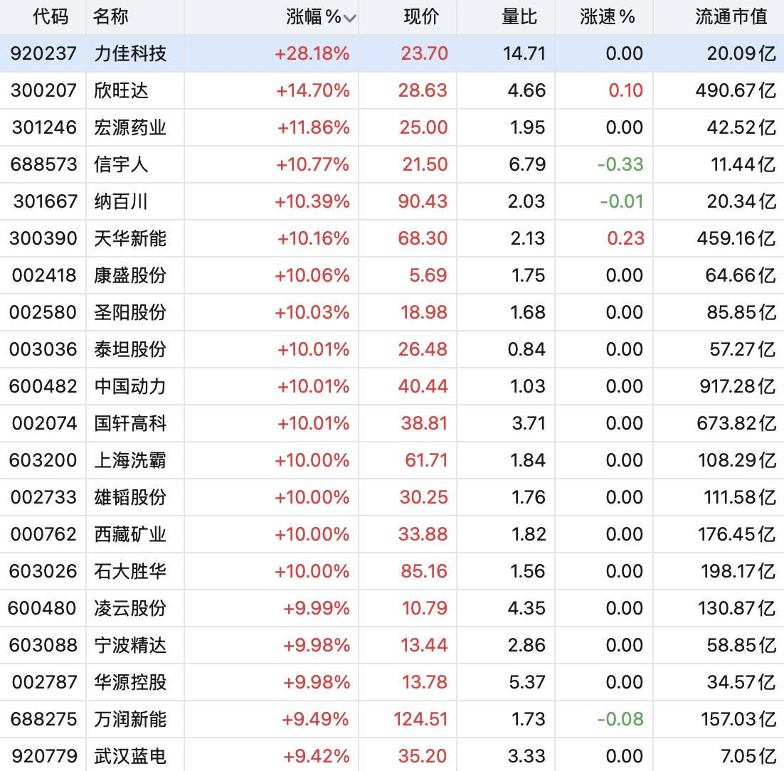 具体来看,锂电池概念中,力佳科技涨超28%,欣旺达涨超14%,康盛股份、圣阳股份、泰坦股份、中国动力、国轩高科、西藏矿业等多股涨停。