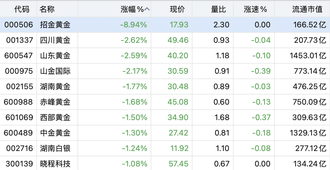 贵金属板块跌幅居前,招金黄金跌近9%,四川黄金、山东黄金、山金国际均跌超2%。