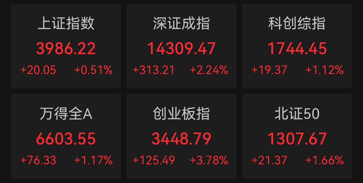 4月10日,A股四大股指集体收涨。沪指涨0.51%,深成指涨2.24%,创业板指涨3.78%,刷新2021年底以来收盘新高;科创综指涨1.12%。