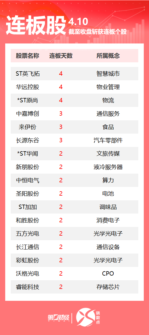 4月10日,Wind数据显示,A股市场共计78只个股涨停。其中物业管理板块华远控股收获4连板,食品股来伊份3连板,CPO概念股沃格光电2连板。一图速览今日连板股>>